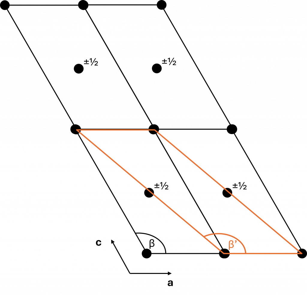 Face-centred refers to lattice points arranged on every face of the parallelepiped. Below is the face-centred monoclinic unit cell viewed along the b axis. Have a go at drawing out multiple of these unit cells and the resulting lattice points on paper. Identify the base-centred monoclinic unit cell within this lattice point arrangement. The answer(s) are on the next page.