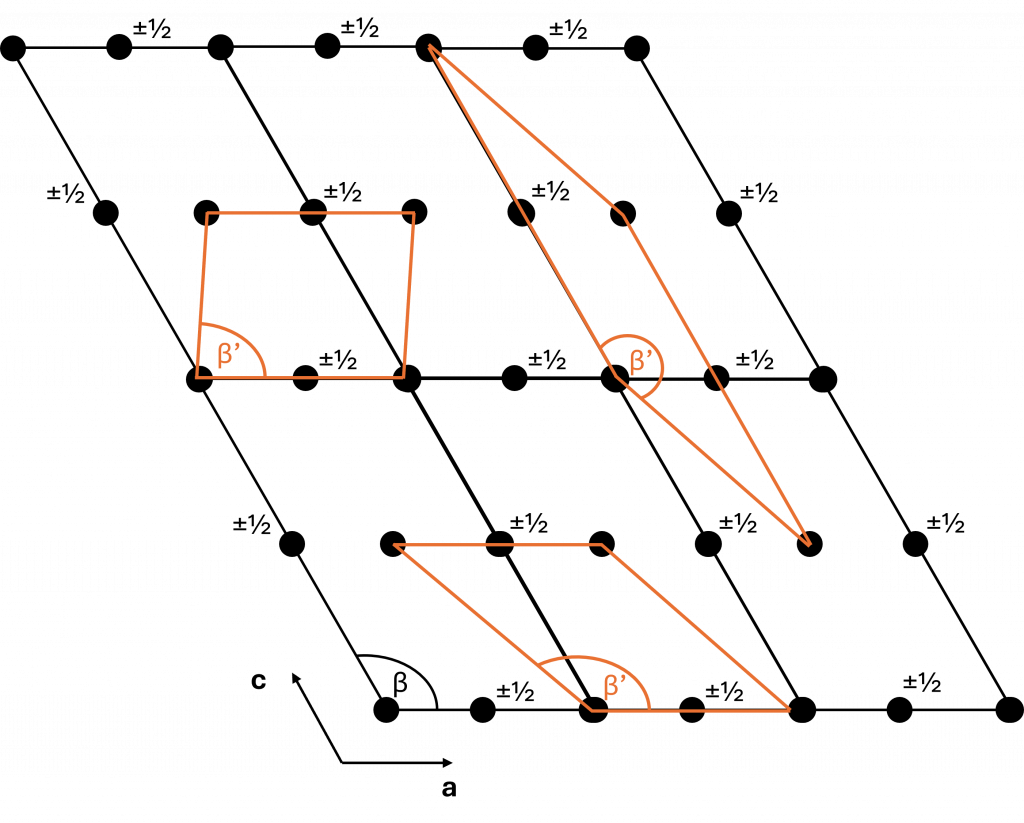 If you would like extra practice at different representations of unit cells, have a go at identifying the primitive unit cells in face-centred or body-centred monoclinic lattices. As we have shown these lattice types to be identical to the base-centred lattice, and the base-centred lattice has a primitive unit cell, body-centred and face-centred must also have primitive unit cells representing their lattices. You could also try identifying the body-centred unit cells in the lattice built from face-centred monoclinic unit cells (or vice versa).