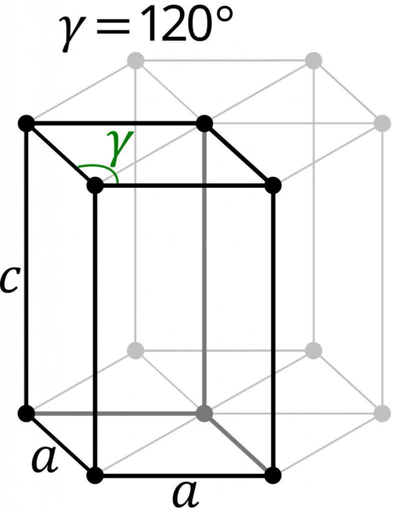 The trigonal crystal system can adopt either of these lattice types, depending on the exact space group. The hexagonal crystal system only adopts the hexagonal lattice. As with the tetragonal lattice, there are two lattice parameters free to vary. For the conventional unit cell of the hexagonal lattice, this is a and c. For the conventional rhombohedral unit cell this is a and \(\alpha\). The rhombohedral unit cell is a special shape of parallelepiped called a rhombohedron (each face is a rhombus), hence the name.