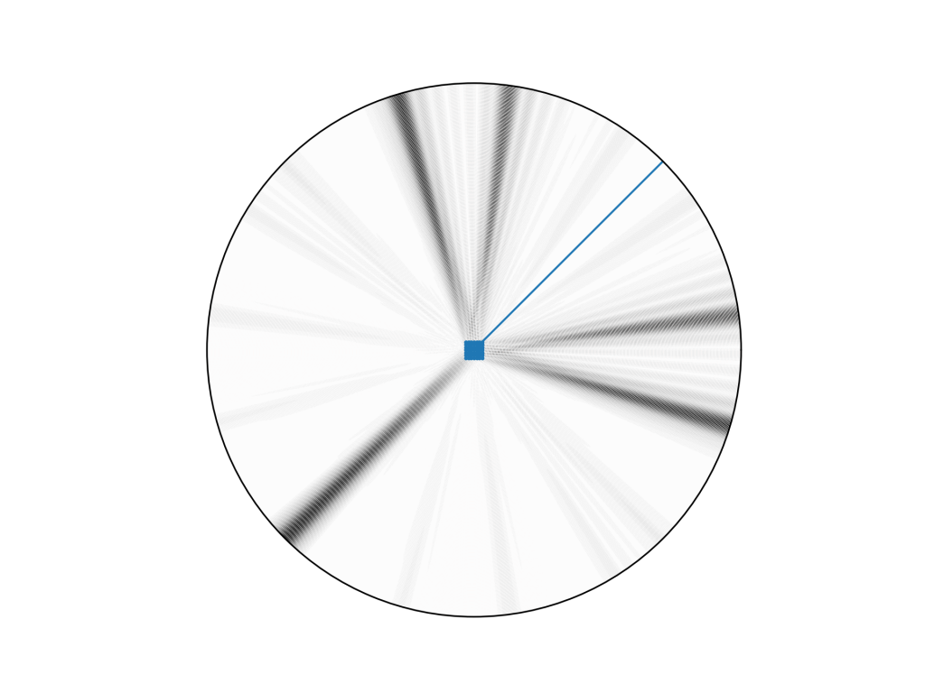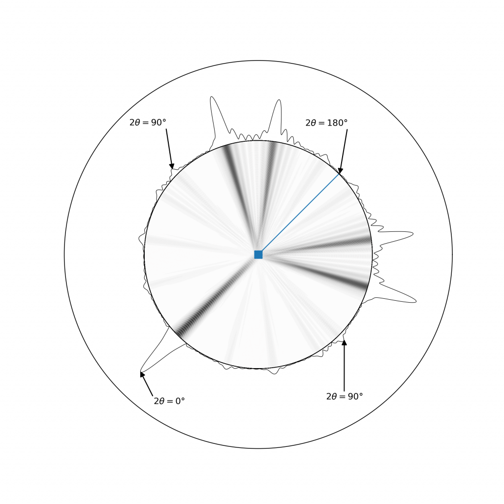 The visualisation shown above is a calculation of the wavefront produced by scattering. Plotted on the edge of the below figure is the amplitude of the wavefront in each direction. The calculation of this from individual scattered waves is given in the python notebook provided at the end of this page.