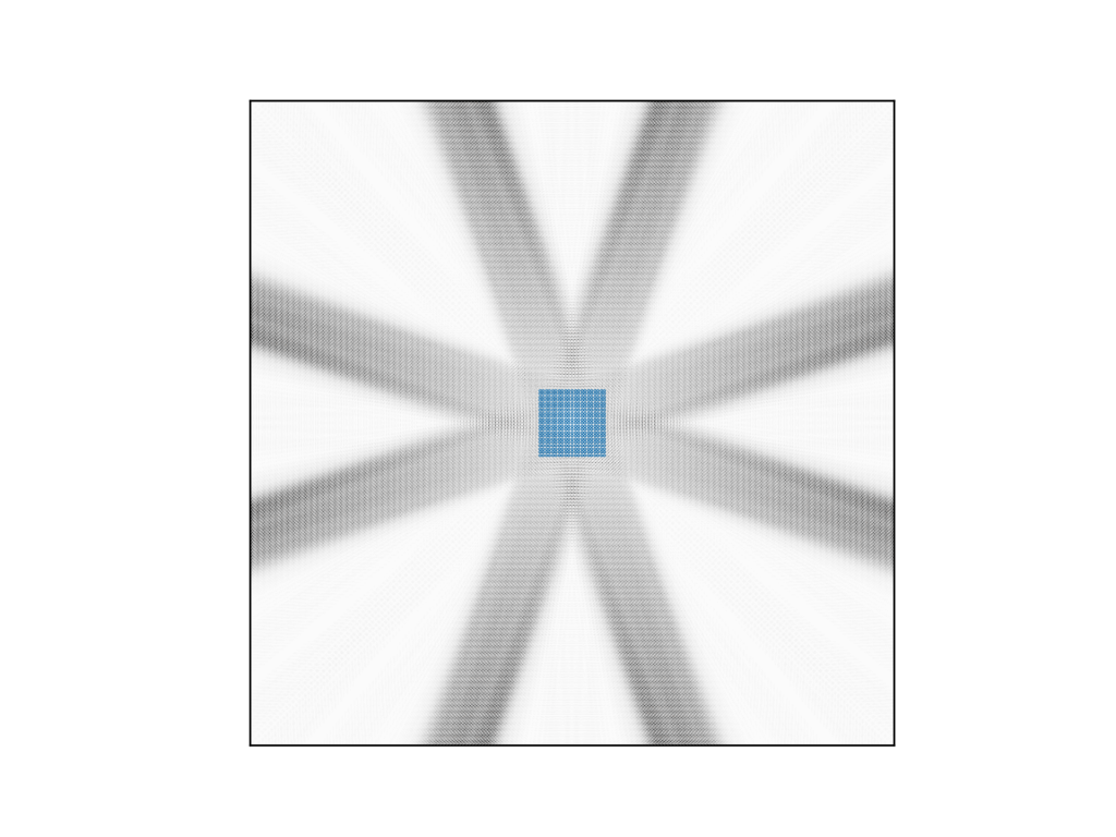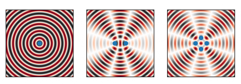 Each blue dot is a scatterer. In a diffraction experiment, a series of scatterers all scatter light in all directions (in 3D, though here we are examining it in 2D for simplicity). In the image above, the light originates from perpendicular to the screen (imagine shooting a beam of light from your eyes onto the page). If we extend this to an array of many scatterers, rather than up to 4, the below image is obtained. Note that the exact images obtained depend on the frequency of light used and the arrangement of scatterers.