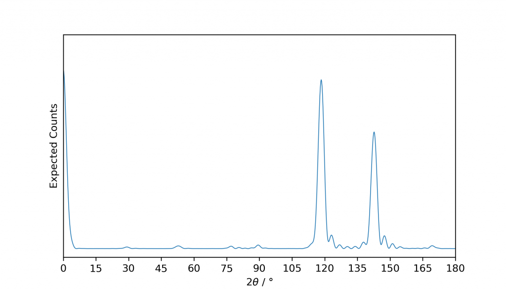 As you can see, we have the interference pattern as a function of \(2\theta\). In an experiment, the number of photons detected at each angle are what is measured. The detector in lab diffractometers simply moves in an arc around the sample holder. These photons, acting as particle-like when they are detected, follow a probability distribution proportional to the square of the amplitude of the wavefront (from quantum mechanics). If we combine this with unzipping the plot, we obtain the data plotted in the format usually seen.