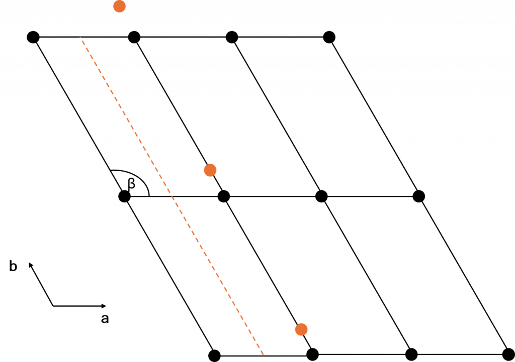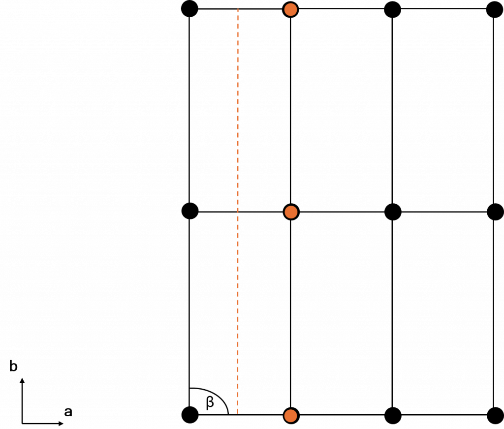 The mirror plane shown above will only map the orange points onto pre-existing lattice points if the angle \(\beta \) is \(90 ^{\circ}\), as shown below.