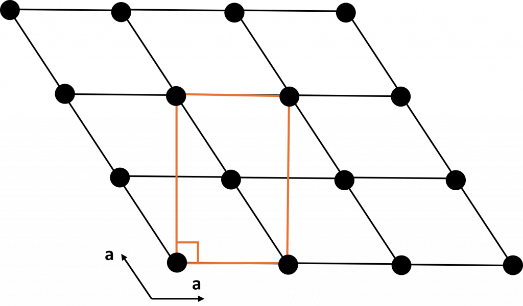 This new cell appears equivalent to the base-centred orthorhombic lattice but it is distinct by the symmetry it possesses. In the same way that any lattice discussed on this site is a special case of the triclinic lattice, the hexagonal lattice is a special case of the base-centred orthorhombic lattice where \(|\mathbf{a}| = |\mathbf{b}| \sqrt{3}\).