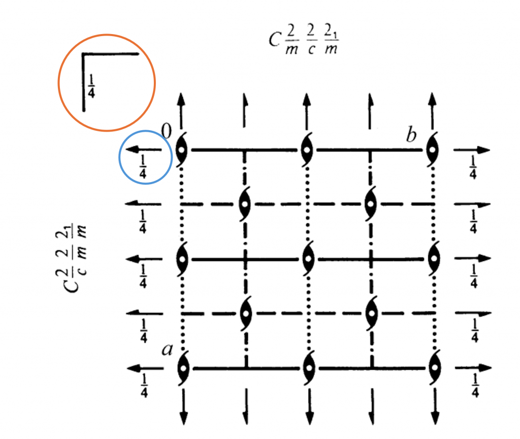 The symbol for a mirror plane or a rotation axis perpendicular to the viewing axis can sometimes have a fraction next to it. This represents the height of the symmetry element. This can be seen below in the space group diagram of \(Cmcm\). The symbol for a mirror plane has a \(\frac{1}{4}\) next to it. This signifies the mirror planes are at a height of \(\frac{1}{4}\) and \(\frac{3}{4}\), rather than the usual \(0\) and \(\frac{1}{2}\). The same can be seen for the two-fold rotation axis highlighted in the blue circle. Space group diagrams for high-symmetry space groups can get complicated quickly.
