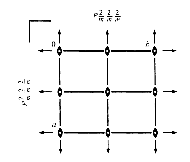 Mirror planes are represented as bold lines in space group diagrams when parallel to the viewing axis. They are represented as a right angle in the top corner of the diagram when perpendicular to the viewing axis. Below is the space group diagram of \(Pmmm\). Note the mirror planes shown as bold lines at \((0+\frac{n}{2}, b, c)\) and \((a, 0+\frac{n}{2}, c)\). In the top left hand corner is the symbol for a mirror plane present perpendicular to the viewing axis (the \(c\) axis).