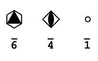 Only the one-fold (inversion centre) and four-fold roto-inversions are truly new symmetry elements, though understanding the process leads to understanding them all. A one-fold roto-inversion is more commonly known as an inversion centre, and simply leads to inversion through a point. The inversion centre is simply represented as an unfilled circle. The four-fold roto-inversion is represented as the symbol for a two-fold rotation inside an unfilled square. These do not come up as often as other symmetry elements but must be understood nonetheless.