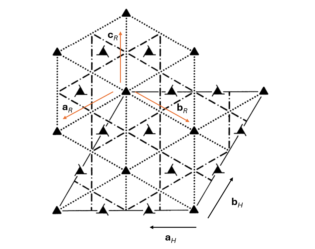 Both hexagonal and rhombohedral unit cells are shown. It should be noted that 2D representations of rhombohedral unit cells do not typically show the 3D nature of the cell well. Nonetheless, the vector \(\mathbf{c}_{H}\) is parallel to the vector \(\mathbf{a}_{R} + \mathbf{b}_{R} + \mathbf{c}_{R}\). Similarly, the vector \(\mathbf{a}_{R}-\mathbf{b}_{R}\) is parallel to the vector \(\mathbf{a}_{H}\).